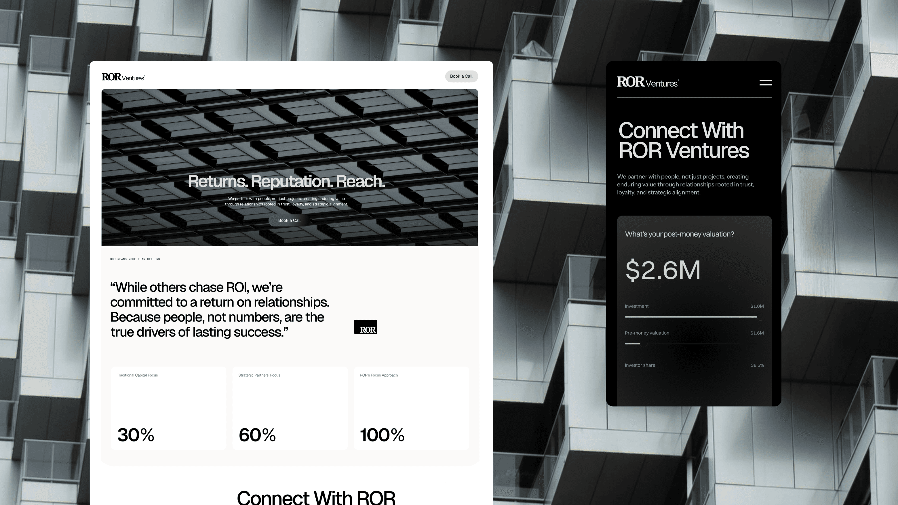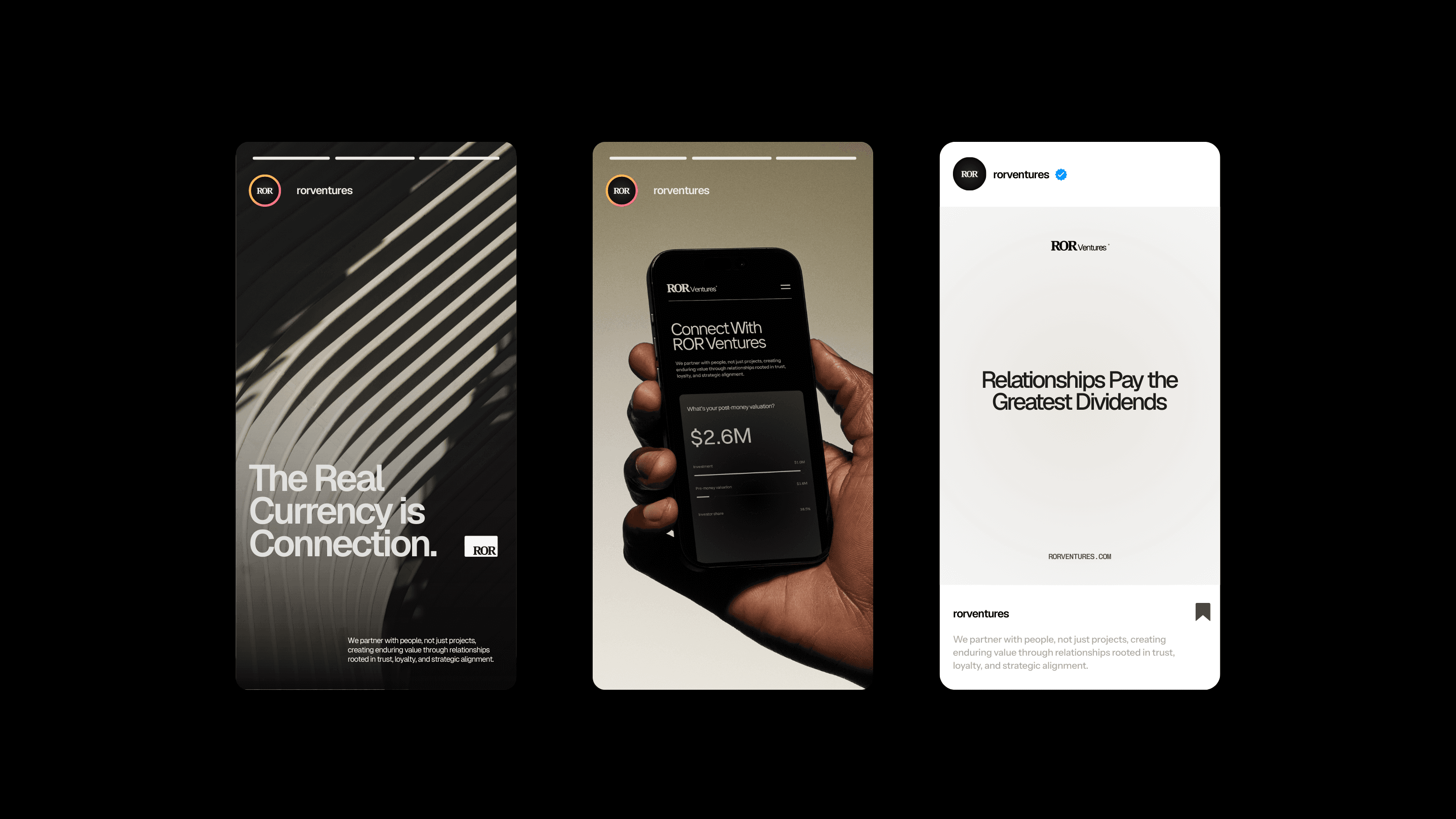 The final result delivered a polished, cohesive presence for ROR Ventures. The brand and website now communicate trust, clarity, and a modern sense of luxury appropriate for the venture capital landscape.